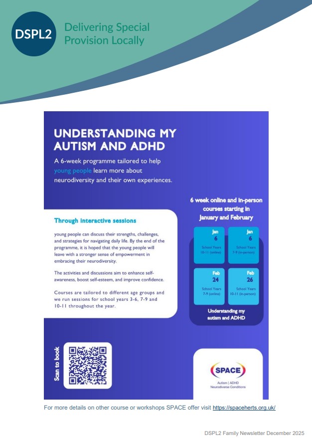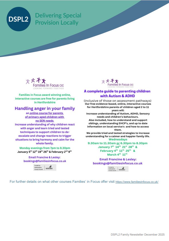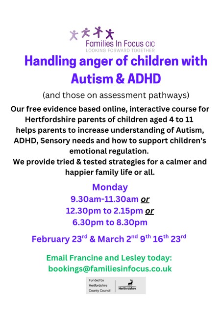 Please find attached links to free online courses for parents and carers run by 'SPACE' Supporting Families in Hertfordshire, ADD-vance, NHS Herts Community Trust (HCT) and Angels