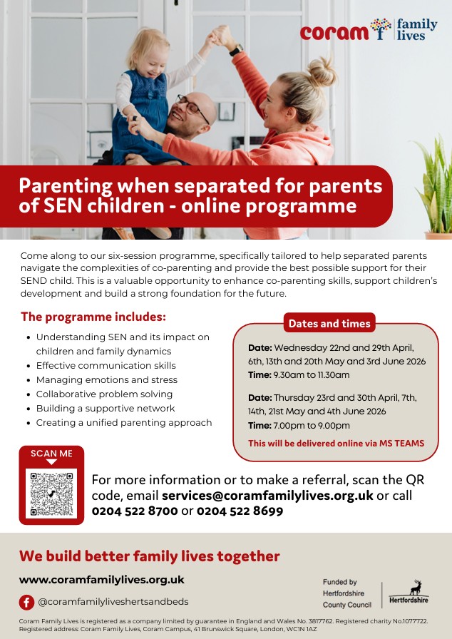 Please find attached links to free online courses for parents and carers run by 'SPACE' Supporting Families in Hertfordshire, ADD-vance, NHS Herts Community Trust (HCT) and Angels